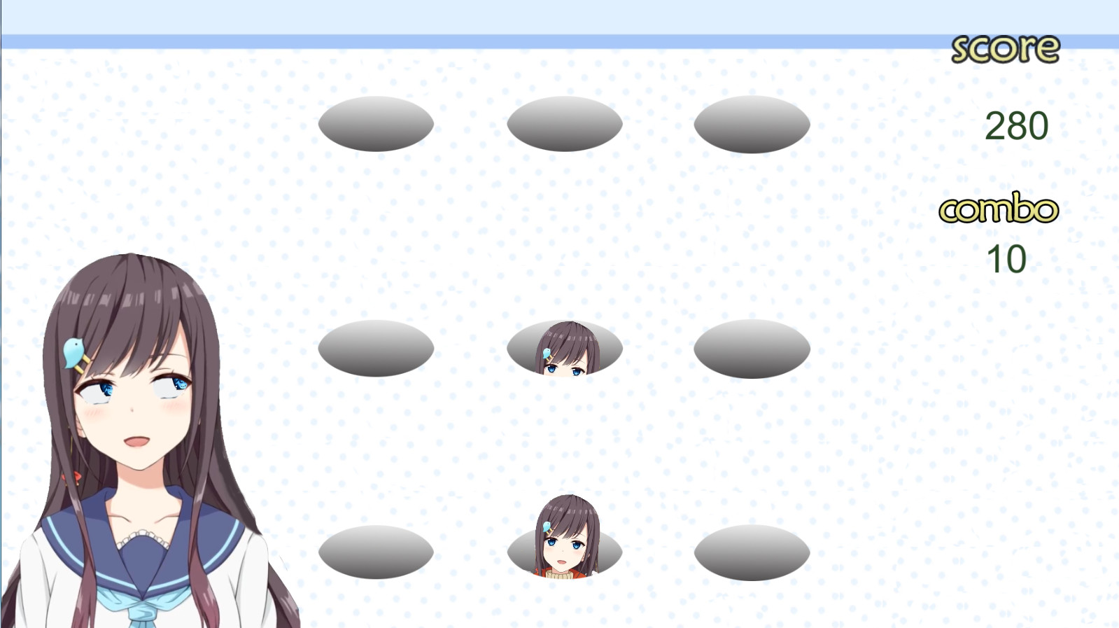 这是一款模仿“打地鼠”(Whac-A-Mole)游戏玩法,制作的简单小游戏。 游戏内容主要是你需要用鼠标左键点击冒出来的美女头像,当你获得足够积分时(或达到条件时),你将进入下一关。