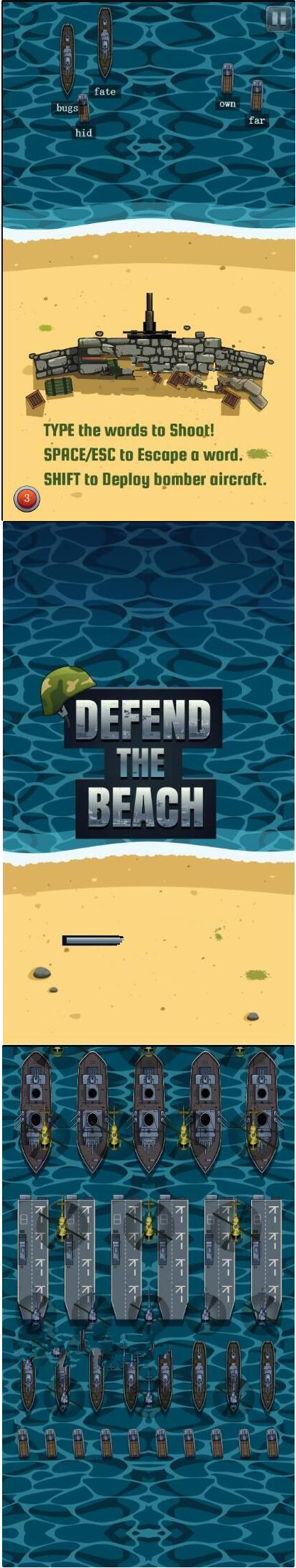这是一款联系打字的游戏,乍一看起来似乎没什么新意。怎么可能,没有新意的东西我会发出来吗?游戏中有各种运输船运输机尝试登陆,玩家要做的就是通过键盘输入相应的字母摧毁它们,但是当他们靠近岸边一定距离后,会发射导弹,步兵登陆!没错,着实打了小编一个措手不及。上手了就又轻易停不下来了。